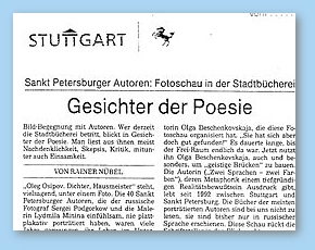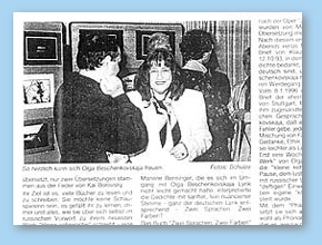 *** Westdeutscher Rundfunk Köln 12.10.95 Sehr verehrte Frau Beschenkovskaja, *** 8.Januar 1996Landeshauptstadt Stuttgart Der Oberbürgermeister Sehr geehrte Frau Beschenkovskaja, vielen Dank für Ihre freundlichen Zeilen und die Übersendung Ihrer gelungenen Gedichte. Auch ich wünsche Ihnen für das Neue Jahr alles Gute und verbleibe mit freundlichen Grüßen Dr. Manfred Rommel *** Дорогая Olga!